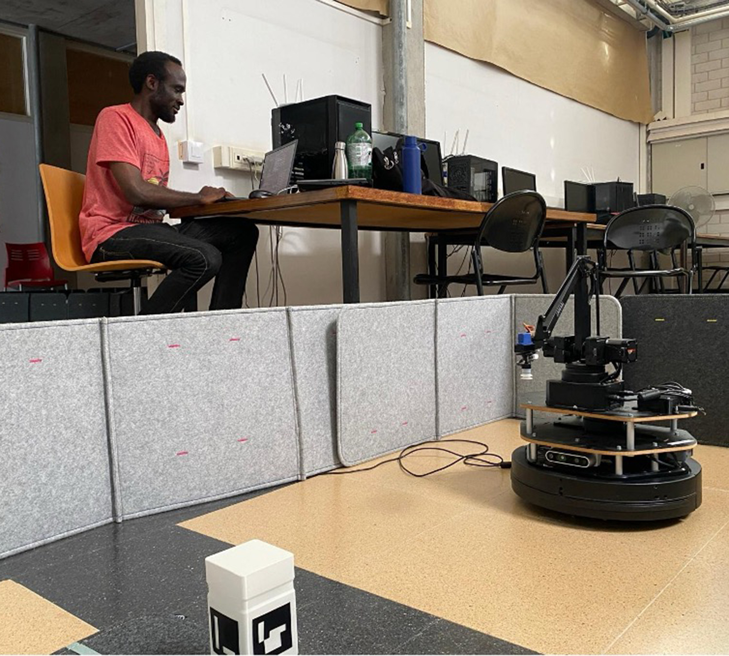 The challenge was to program a TurtleBot 2 mobile robot, equipped with a 4-degree-of-freedom robotic arm, to perform a complete task without human guidance. The robot had to start with no prior map of its environment and execute the following mission: